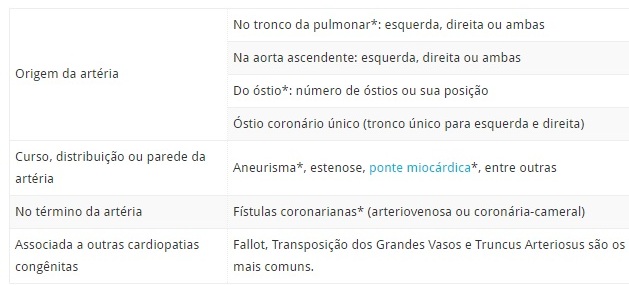 As anomalias coronarianas são classificadas da seguinte forma: (assinalamos com * aquelas mais comuns na prática clínica)